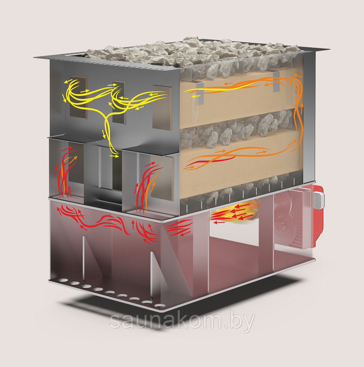 Равномерный нагрев камней и легкий парГеометрия каменки разработана таким образом, чтобы обеспечить равномерный нагрев большого объема камней (300 кг) и получить много лёгкого пара. Факел пламени горелки равномерно прогревает нижнюю часть ёмкой каменки. Раскаленные дымовые газы совершают несколько оборотов в сложной системе газоходов, благодаря чему тепло эффективно передается боковым стенкам каменки и аккумулируется в камнях.