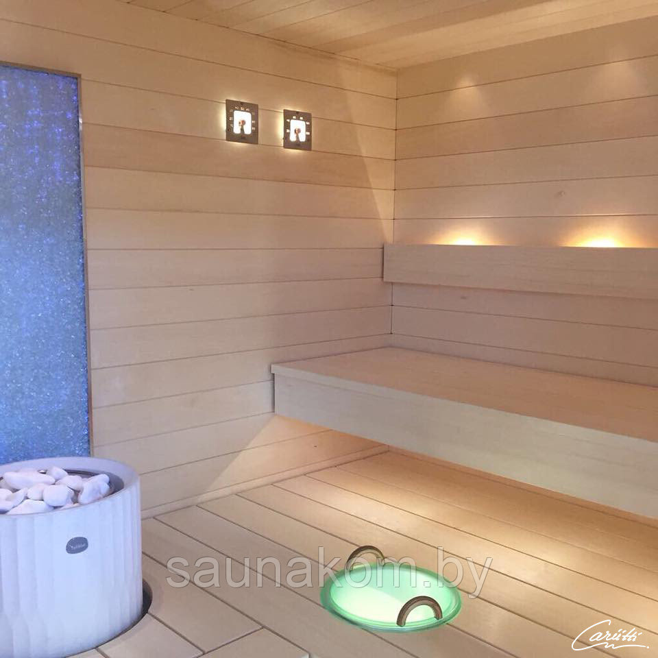 Шайка со светодиодной подсветкой, которую можно использовать как отдельный самостоятельный светильник. Она поставляется вместе с блоком питания, который находится во влагозащищенной коробке. Шайку нельзя установить выше 1 м от пола сауны, а блок питания не выше 80 см от пола сауны..